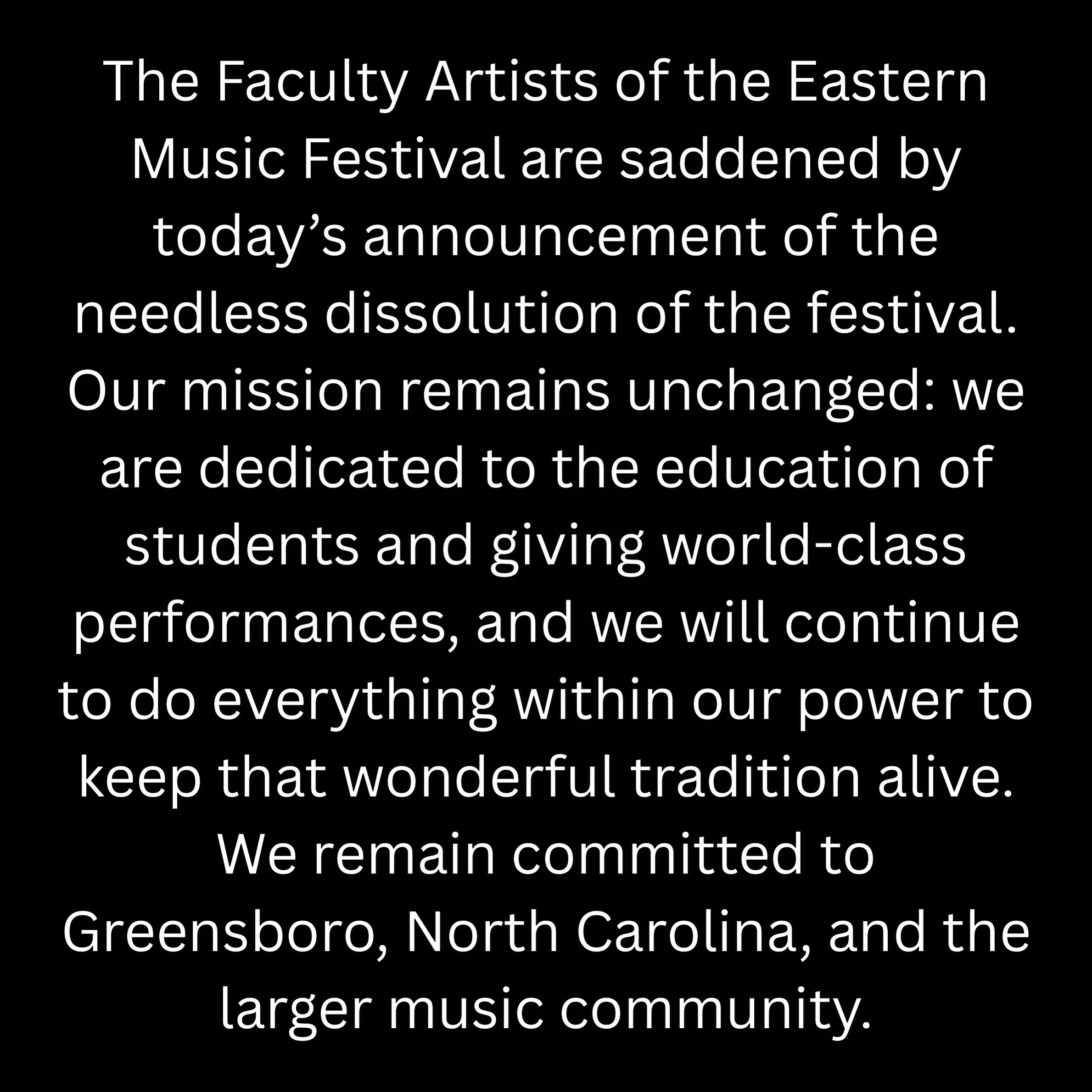 The faculty artists of the Eastern Music festival are shocked and appalled at the board's decision to cancel this summer's festival. Since 1961, elite professional and student musicians have called Greensboro their summer home. Through good times and bad, the festival proceeded uninterrupted, even during the COVID-19 emergency. During that trying time, the festival didn't shut down, but transitioned to online learning, with complete buy-in from both students and faculty. The board's unnecessary, irresponsible, and unilateral decision to cancel the festival displays a complete failure of leadership. It is a slap in the face, not only to the faculty, but to prospective students, alumni, and the Greensboro community. The board has prioritized self-destructive, punitive action over the well-being of students and the musical enrichment of North Carolina. The faculty artists of EMF love this festival, love our students, and love this community. We continue to be willing to sit down together at the same table to come to an agreement that ensures a thriving future for EMF.